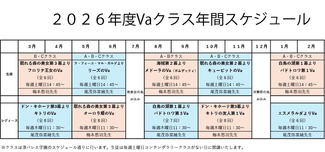 新着情報NEWS & TOPICS Vaクラスを新設しました!! 2026年4月18日 淳バレエ学園では通常のクラスに加えて、Vaクラスを新設しました。 このクラスではバレエのソロの踊りであるバリエーションを深く学ぶことができます。 2ヶ月かけて一つの踊りを練習し、バリエーションに対する深い知識やストーリーの背景などもしっかりと学びながら細かくレッスンします。 レディースクラスとA~Cクラスが対象です(小学1年生~高校生) 現在淳バレエ学園に通っておられない方も受講していただけます。 レディースクラス:通常レッスンのチケットと併用いただけます。 A~Cクラス:¥13,200(税込)/6回 お気軽にお問い合わせください。 前のページに戻る